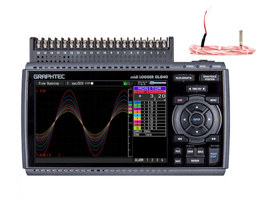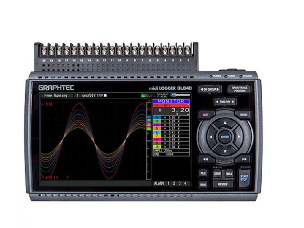 De Graphtec GL840 is een intuïtieve datalogger met een helder 7" TFT kleurenscherm. Het instrument is geschikt voor simultaan met op 20 kanalen, op maximaal 10ms meetinterval. Thermokoppels, Pt100's, Pt1000's en JPt100.