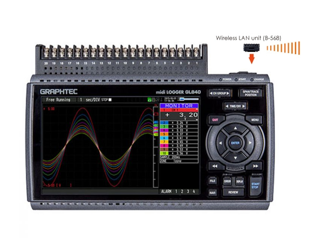 De Graphtec GL840 is een datalogger met standaard 20 analoge kanalen. Dit is uitbreidbaar naar maximaal 200 kanalen, met behulp van optionele uitbreidingsmodules.